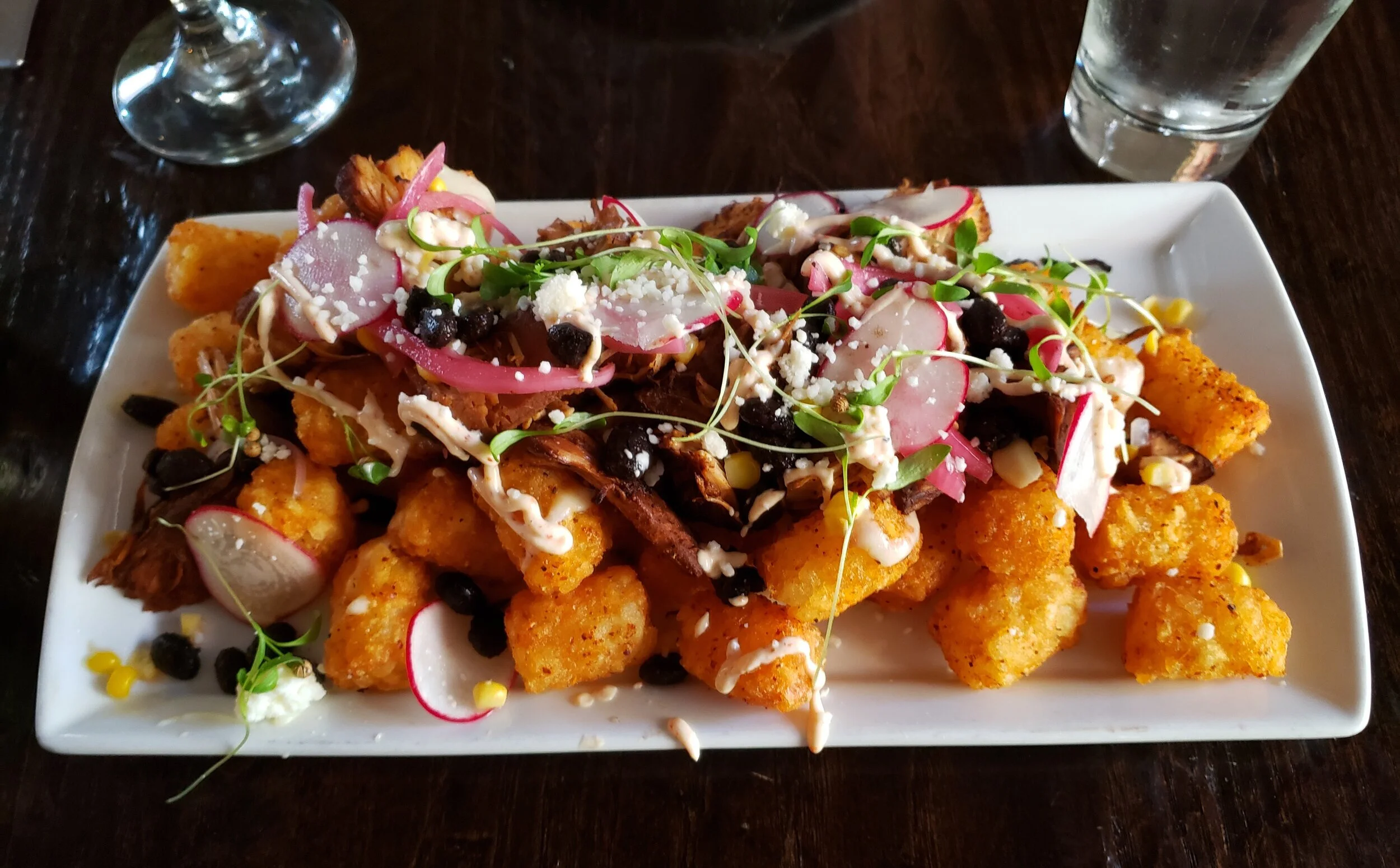 Crispy Tater Tots, Serrano Queso, Black Beans, Pickled Corn and Red Onion, Radish, Cilantro, Lime Crema, Queso Cotija, Jackfruit